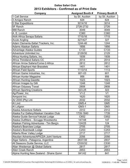 2013 Exhibitor List And Booth Locations Dallas Safari Club